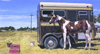 | The soft sheen of sweat, the tense muscles and popping veins of the horse in Richard McLean's 44 x 54 inch oil painting Kahlua Lark (1979) evokes a sense of wonder. You can almost smell the strands of hay intermingled in the soft packed dirt, feel the heat of the mid-day sun as it beats against the red barn wall. True to the roots of photorealism, the composition is so exact many people might wonder if it's a painting at all.