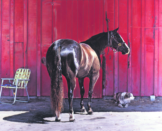 | | | | | | The soft sheen of sweat, the tense muscles and popping veins of the horse in Richard McLean's 44 x 54 inch oil painting Kahlua Lark (1979) evokes a sense of wonder. You can almost smell the strands of hay intermingled in the soft packed dirt, feel the heat of the mid-day sun as it beats against the red barn wall. True to the roots of photorealism, the composition is so exact many people might wonder if it's a painting at all.