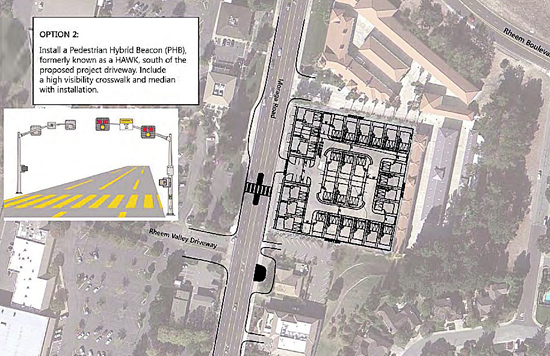 The documents prepared by Town staff included a report by traffic consultant Fehr and Peers that made proposals regarding pedestrian crossing, which they consider to be the bigger challenge posed by this project, from a traffic point of view. The proposals ranged from pedestrian activated lights to beacons allowing safe passage from the development to the Rheem Center.