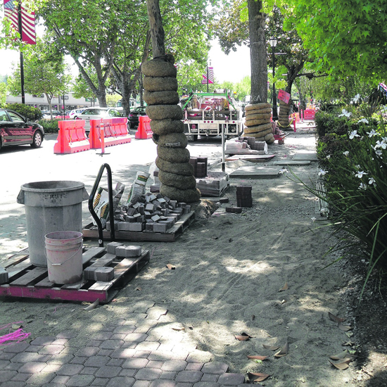 | Although the project is a bit behind schedule, pedestrians are already enjoying the substantially complete streetscape project that is transforming downtown sidewalks. Starting from the Round Up Saloon, decorative brick pavers have been marching their way east along the south side of Mt. Diablo Boulevard and have made it to the corner of Mt. View Drive, home of Trader Joe's.
