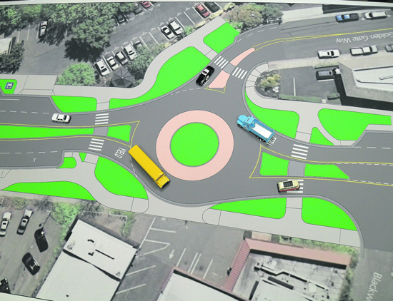 | They're not just in Europe anymore, possibly coming to a Lafayette intersection near you - a circular landscaped donut in the middle of the road, better known as a roundabout. The intersection at Golden Gate Way and Mt. Diablo Boulevard, near the Gazebo, is 100 feet wide with two busy lanes in each direction, making it a challenge to cross, so the City is exploring the possibility of installing a roundabout there that would substantially increase pedestrian safety and at the same time, keep traffic moving.