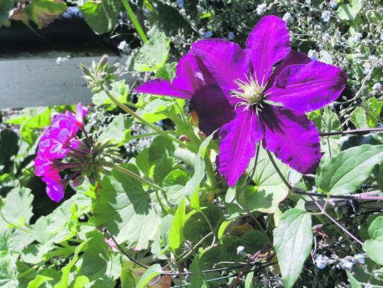 Clematis shines as it twines with forget-me not and geranium along a fence. Photos Cynthia Brian