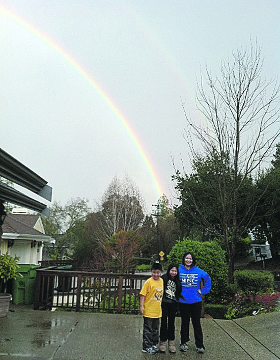 | Mugging it up after the double rainbow sighting in Lafayette on Dec. 22, from left: Declan, Alyssa and Kaitlyn Tsuyuki.