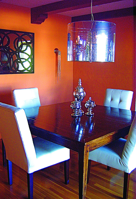 |  | | A rich wall color highlights both the leather chairs and mercury glass accents.