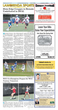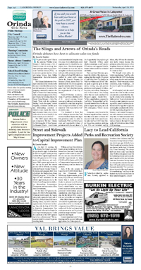 Page A 6 - A 7 The Slings and Arrows of Orinda's Roads Orinda debates how best to allocate sales tax funds Street and Sidewalk Improvement Projects Added to Capital Improvement Plan Lacy to Lead California Parks and Recreation Society Earth Day at Wagner Ranch