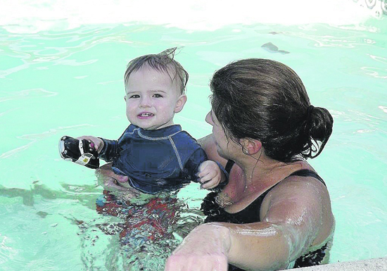 Still, 16-month-old JR Morgan happily splashed in 90 degree water at Sherman Swim, wearing a swim diaper, safe in the arms of instructor Katy Conlan. While engrossed with a plastic toy, JR was being led through a series of shallow end hops and skips, kicks and scoops, exposing him to the rudimentary dog paddle motion.