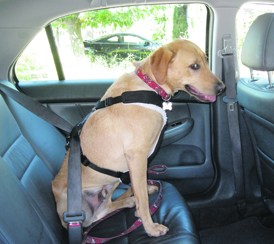 | Published September 11th, 2013 | Car Travel with Pets | By Mona Miller, DVM |  | Mona Miller's 2-year-old golden lab, Luka, travels safely in his car harness.