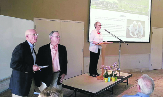 Lafayette Community Foundation board members Dick Holt and Don Jenkins introduce Senior Rides director Elaine Welch at the recent Senior Symposium. Photo Matt Shriner