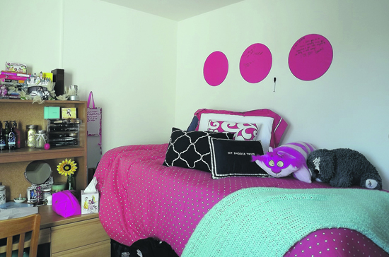 Pink was the coeds' go-to color. Brittani Decloedt was just stepping out when Lamorinda Weekly reached her dorm room. "We're going to definitely add more to it," Decloedt said of their decorating project in progress. "My first impression of the room was that it was bigger than a lot of other dorms I've seen at different colleges. I also was excited to have my own closet and desk area.