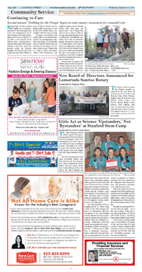 Page A12 - A13 Continuing to Care Second annual 'Trekking for the Troops' hopes to raise money, awareness for wounded vets New Board of Directors Announced for Lamorinda Sunrise Rotary Girls Act as Science 'Upstanders,' Not 'Bystanders' at Stanford Stem Camp Senior Symposium a Stellar Success