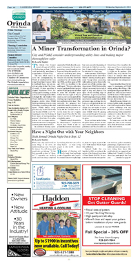 Page A 6 - A 7 Orinda Police Blotter A Miner Transformation in Orinda? City and PG&E consider undergrounding utility lines and making major thoroughfare safer Have a Night Out with Your Neighbors Sixth Annual Orinda Night Out is Sept. 12