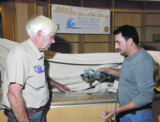 | By Laurie Snyder |  | City facility attendant Les Graham (left) and a contractor from Diamond Stoneworks recently helped the Orinda Library prepare for installation of a new inventory system. The high tech tool will offer faster self-service, says library manager Beth Girshman, and it will also help staff keep collections vibrant by monitoring which books are circulating and which aren't. If you'd like to help prepare books for scanning by the new system, call the library to volunteer. Photo Ohlen Alexander