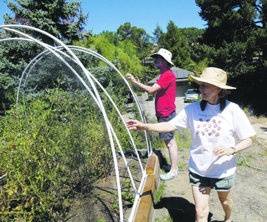 | Published September 25th, 2013 | The Next Step of the Lafayette Food Revolution | By Sophie Braccini |  | Linda Riebel and husband, Brad Wade, install protection around their tomato plants. Photo Sophie Braccini