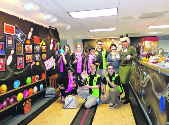 | Lafayette city staffers strike a pose at the decked out "Lafayette Lanes" for Halloween. The creative public servants that keep the city running came up with an impressive 1950s bowling alley concept for their annual themed extravaganza. No detail was "spared" putting together the magic: borrowed bowling balls, pins and shoes, along with a popcorn maker, candy, "beer" on tap, and clever photo-shopped images of the mayor and winning teams from years past. The "Happy Valley Girls" busted out the bedazzler to add a little sparkle to their stylish bowling shirts and named themselves along with rival team the "Burton Valley Bowlers" after street names in town, Betty Lane, Lucas, Millie and Flo (short for Florence). Cocktails, tattoos, cigars, retro hairdos and actual bowling lanes that extended into the lobby rounded out the space that usually is a bit more business-like.