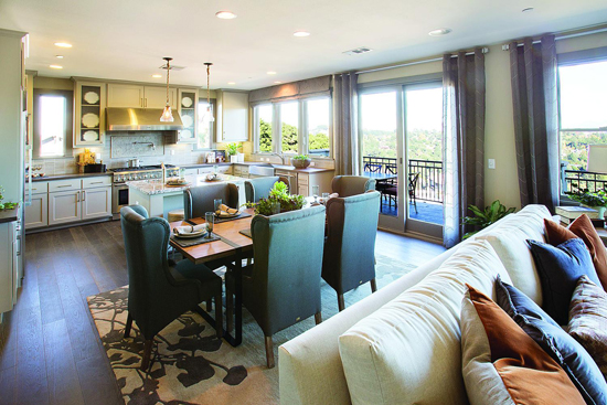 Visitors enter the model home through a generous hard surface patio surrounded by half walls, with high ceilings and wide-plank wooden flooring in its interior. The kitchen featured high-end stainless steel appliances; its center island and counter surfaces were quartz. The patio off the kitchen in the model home felt especially airy as the lot sloped away from the house on that side.