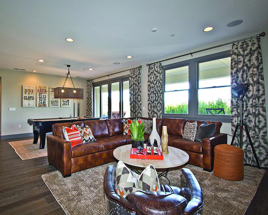 Upgrades to the model, noted in print room by room, included custom pendant lighting in the kitchen, a large suspended light in the family room, crown molding and cabinet color changes. The model home has already been sold, but it won’t be occupied until the development is complete. If you have walked the model and still can’t envision material options or upgrades, a design center in Livermore has the building materials on hand.