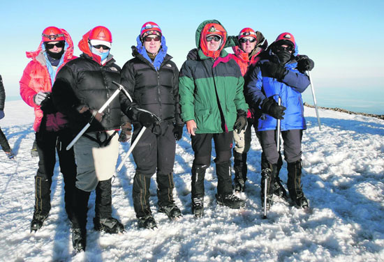 It took three days to get from the base to the summit. The hearty hikers made it up a 5,000 foot elevation gain the first day and slept at rustic Muir Camp. They continued on the next day, bunking at High Camp, and in the wee hours of the third day, rose at midnight, strapped on a head lamp and hit the trail for the final push to the summit, arriving at the dramatic cauldron at 5:30 a.m. to watch the sunrise.