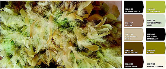 By using tools like Sherwin Williams' Chip it, you can see browns and earth tones are hidden within mint green feathers on this wreath. Tools like this, which are available online, are incredibly helpful in creating rich, layered and surprising arrangements, and equip you to make bold choices. |