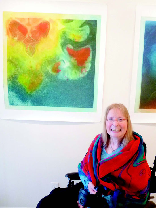 The story of Jameson is one of passion and transcendence. A young lawyer who specialized in health care advocacy for the underprivileged, she was diagnosed with MS almost 25 years ago. The disease first affected her speech, but she regained it later. "I was very disturbed by my lack of fluidity with words," she remembers. "I went to a local art class ... and after one class I knew I wanted to become an artist. I felt I could change the world through art." Jameson took every art class she could find. "I knew it was where I was supposed to be," she says. Early on her love of colors developed and she produced mostly floral/abstract art.