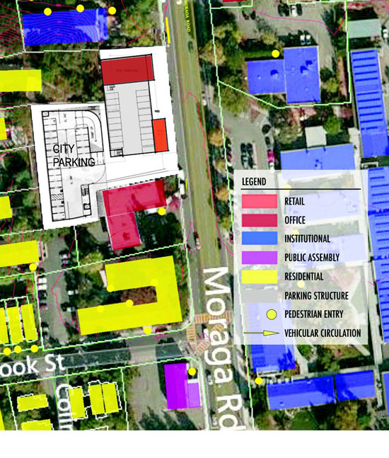 One option discussed is a two-way left-turn lane in the center of Moraga Road. With average daily traffic counts of approximately 20,000 trips a day on the thoroughfare, commissioners were mindful to encourage uses like all-day employee parking at the garage, to minimize additional cars on that road.