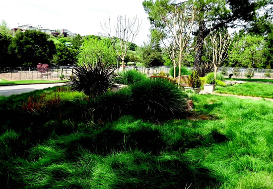 Wild grasses are found throughout Pat Rose's Moraga garden. A vineyard is tucked behind this grassy knoll. |