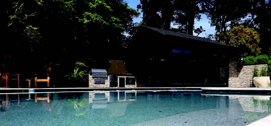 To one side of the pool the hillside slope was pushed back and is kept at bay by a waist-high retaining wall, allowing space for a built-in barbecue, just steps from the outdoor dining room in the Diraimondo's back yard. |