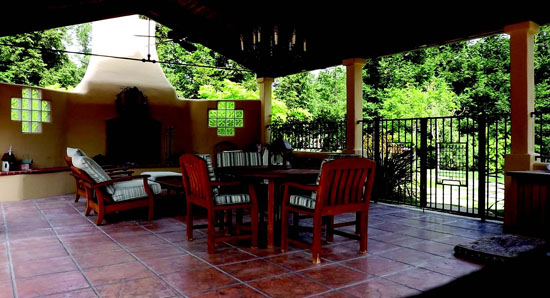 This covered outdoor area with wood burning fireplace at the Rose home in Moraga offers a cozy space for entertaining. |