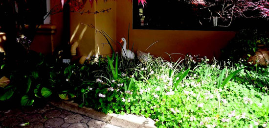 Two ceramic geese tucked into a corner near the Rose house entry are by far the quietest wildlife on the lot. |