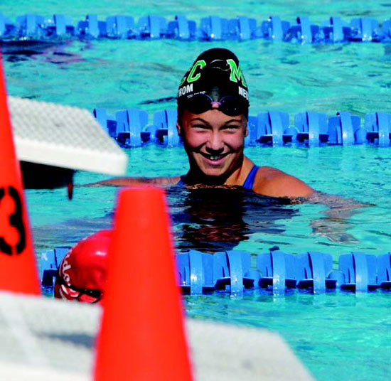 Moraga Country Club's (MCC) Erin Neustrom celebrated her first-place finish in the girls 15-18 100-yard freestyle. |