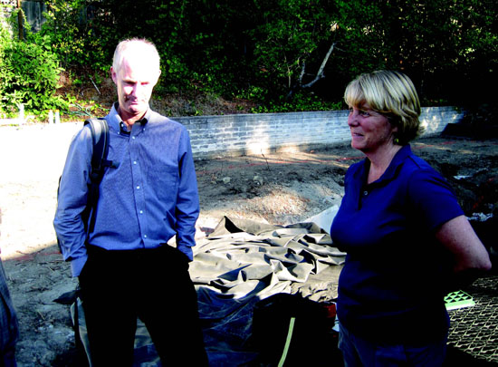 | Contra Costa County Water District water conservation coordinator Chris Dundon, left, learns about the cistern project from landscape contractor Roxy Wolosenko. Photo Cathy Dausman |