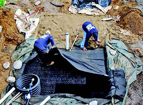 Cistern construction began with the assembly of Eco Rain Cubes. These plastic cubes were shipped flat and assembled into something resembling oversized milk crates measuring roughly 18 by 16 by 27 inches. The cubes were stacked horizontally, five layers high in the pool cavity. The cube collection was double wrapped, first with a felt filter fabric, and then with an impermeable plastic liner. When the project is complete, the cistern will be all but invisible beneath new water-wise landscaping and a bocce court.