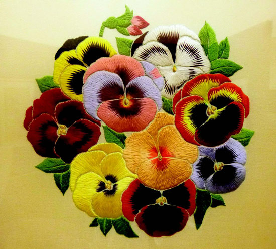 Fu was attracted to the silk material and appreciated the natural designs tremendously. "Working with silk is working with the king of all fibers. The variety is amazing; it comes in strands made of 12 single cocoon threads put together. There is an infinite variety that comes with the silk from either splitting or twisting the strands together, depending on what is required by the design," she explains. It took her seven years to complete the 10 phases of the curriculum. The Japanese Kurenai Kai school of embroidery opened a branch in Atlanta where Fu was able to take advanced classes after the 10 phases of initial training, and she became a certified instructor of the Japanese embroidery center.