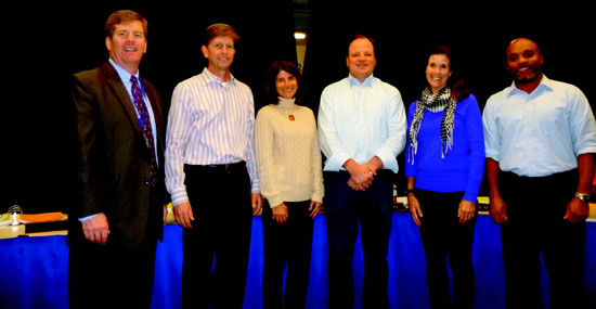 Moraga School District governing board members and superintendent bid farewell to Parker Colvin, center, who will be leaving California at the end of the year. Surrounding Parker, from left: Bruce Burns, Jim Obsitnik, Shari Simon, Heather O'Donnell, Jon Nickens. Photo Sophie Braccini
