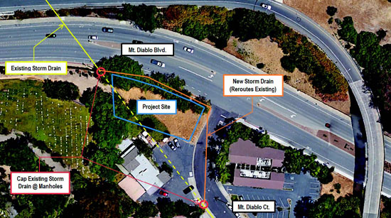 | | | Image provided by EBMUD depicting location of existing and future storm drains. | | | | | | Job number one for the new East Bay Municipal Utility District Diablo Vista pumping plant is to reroute the existing storm drain that cuts diagonally from the edge of the Lafayette Cemetery across the parcel where the new plant will be built at the corner of Mt. Diablo Boulevard and Mt. Diablo Court, and bisects the Blodgett's Abbey Carpet and Flooring parking lot. When complete, the rerouted storm drain will follow the sidewalk on the south side of the street, rounding the corner to connect with an existing storm drain down Mt. Diablo Court.