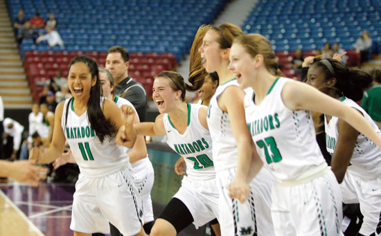 | As time expires, the Lady Mats celebrate their NorCal state final breakthrough against Pinewood. Jessie Wilson (21) Keana De Los Santos (11) Sabrina Ionescu (20) Jordyn Bryant (33) Clair Steele (3) Lauren Sopak (23) Uriah Howard (12) Photos Gint Federas |