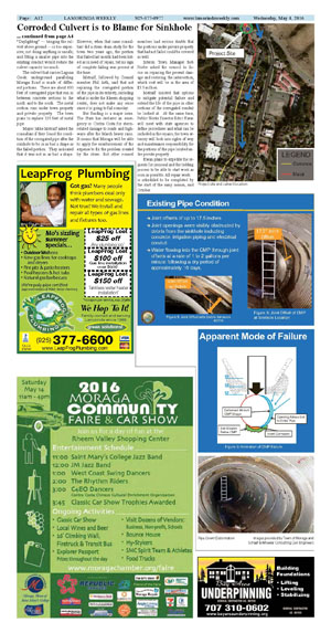 The Town of Moraga established with certainty that the cause of the recent sinkhole is the failing of the 96-inch corrugated metal culvert that runs under the Rheem Boulevard-Moraga Road intersection.