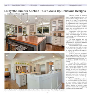 Fans of beautiful kitchens, art, design and delicious food are in for a treat this year as the Lafayette Juniors host their 17th annual Kitchen Tour from 10 a.m. to 3 p.m. on Saturday, May 14.