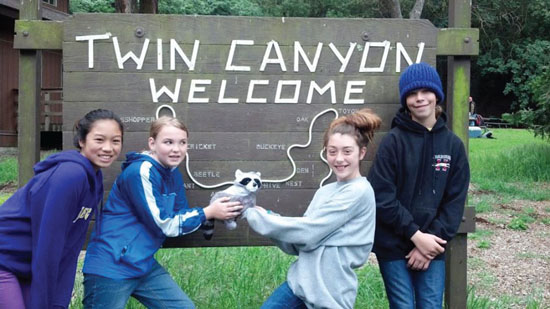 | Four Girl Scouts, along with a raccoon, pose in front of the welcome sign at Girl Scout Camp Twin Canyon in Lafayette. Photo provided |
