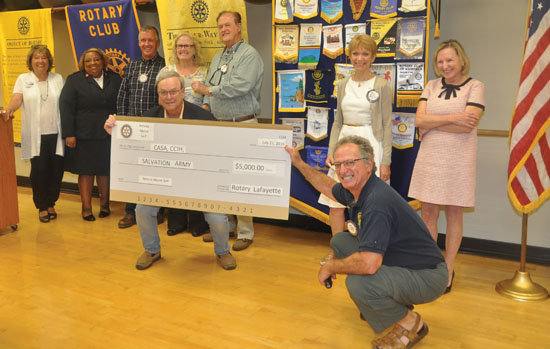 | | | Lafayette Rotary members pose by a giant check showing its gifts to charity. Photo provided | | | | | | On Thursday July 21, the Lafayette Rotary Club made three donations of $5,000 each to local charities who support excellence in education, community involvement and health, food and housing for those in need.
