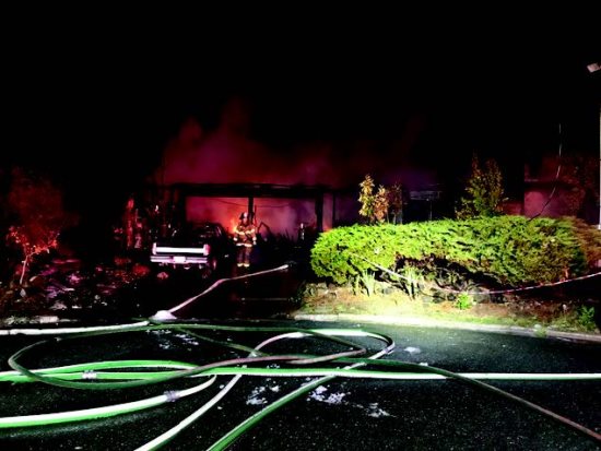 Battalion Chief Felipe Baretto immediately called for a second alarm because of the potential for the fire spreading into the adjacent trees and uphill to neighboring homes. A total of 41 firefighters from MOFD and the Contra Costa County Fire Protection District responded to the incident. Because drums possibly containing nitric and hydrochloric acid were reported in the garage, the Contra Costa County Hazardous Materials Team was called to the scene. Wires were reported down and PG&E secured the electrical and gas lines.