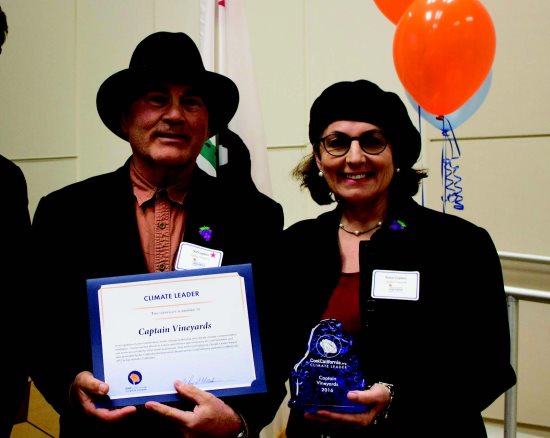 | | Published January 24th, 2018 | Susan and Sal Captain, Moraga's Business Persons of the Year | | | By Sophie Braccini |  | | Captain Vineyards receive the EPA CoolCal Award. Photo provided | Winemaking in Moraga is still a marginal activity, with Captain Vineyards being the only operational commercial winery in Moraga with a production under 300 cases a year, but the activity adds to the town's character and fits the semirural and sophisticated image it wants to project. The performance and passion of owners Sal and Susan Captain, who were chosen this year as Moraga's Business Persons of the Year by the Chamber of Commerce, have made their boutique winery a green leader in the county and state that is recognized with this distinction.