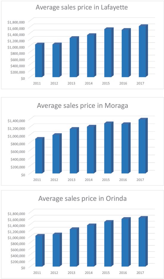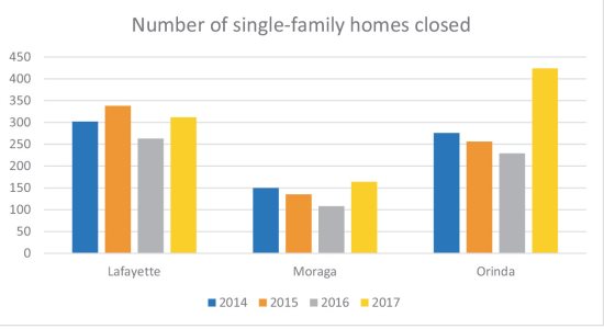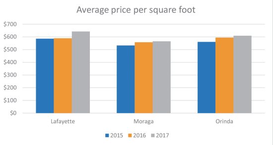 On an average price per square foot basis for reported sales in 2017, Lafayette homes sold for $642.46 up solidly from 2016 when it was $589.47. In 2015 it was $585.87 and an increase from 2014 when it was $546.87. In 2017, Moraga homes sold for $565.37, a slight increase from $558.02 per square foot in 2016, and $532.90 in 2015. In Orinda last year it was $609.13, also a little rise from $594.37 in 2016 and $560.79 in 2015 and continuing the trend that started in 2012. It was $520.77 in 2014 and $489.85 in 2013 and $422.68 in 2012.