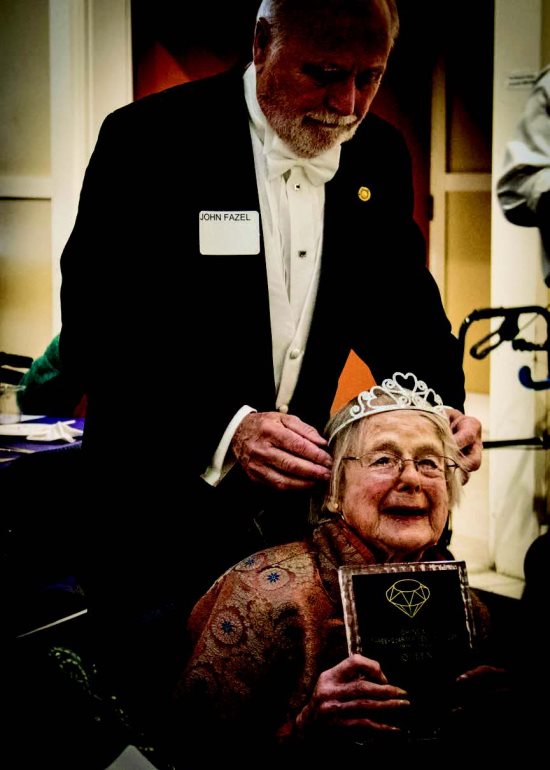 | Published May 30th, 2018 | Centenarians rule three-quarter century lunch | | By Sora O'Doherty |  | John Fazel crowns Queen Elva Rust, who celebrated her 100th birthday on April 1. Photos Sora O'Doherty | Brad Davis, a volunteer member of Lamorinda Sunrise Rotary, was the baby of the year at the 19th annual Three-Quarter Century Luncheon on May 16 at the Orinda Community Church. While at 75, he was the youngest of the 90 attendees, the king and queen were 101 and 100 respectively. There was almost a tie for longest married couple: Joe and June Haughin beat another couple by just one month; both couples having been married for 66 years.