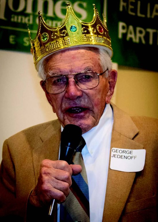 The oldest man present, George Jedenoff at 101 years of age, was crowned king. His wife died two years ago at age 95. While she was ill, he limited himself to only five days of skiing annually. Jedenoff loves skiing, which he took up at the age of 43. Last year he skied on his 100th birthday, and the video of the event became a YouTube phenomenon. "You don't have to be good to be famous," Jedenoff concluded, "you just have to live long enough."