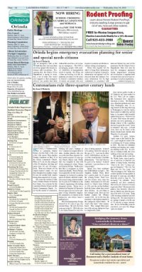 Page A 6 - A 7 Orinda Police BlotterOrinda begins emergency evacuation planning for senior and special needs citizensCentenarians rule three-quarter century lunchOUSD approves water tanks for Wagner Ranch, Sleepy HollowSocial host law amended to include cannabis
