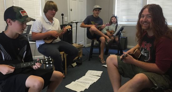 | | | From left: Ukulele students Austin Herting, Cooper Vashel, Ty Herting, and Chase Vashel strum along with instructor Vincent Lay. Photo John T. Miller | | | | | | Talented musician and teacher Vince Lay is running ukulele camps as part of the Music Coop's programs in Lafayette.