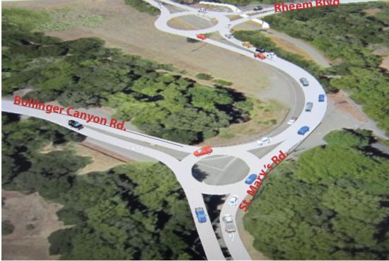 | Published October 17th, 2018 | St. Mary's Road roundabout project discussed with public | | By Vera Kochan |  | Simulation of the two roundabouts as presented at the recent meeting. Photo Vera Kochan | Town representatives and project team members invited the public to attend another community informational meeting Sept. 27 at Saint Mary's College to hear updates regarding the St. Mary's Road and Rheem Boulevard/Bollinger Canyon Road roundabouts. The public was given a choice to attend a 4:30 p.m. or 6:30 p.m. presentation, both of which covered the same information.