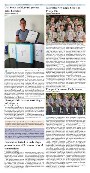 | Published December 12th, 2018 | Lafayette: New Eagle Scouts in Troop 200 | | Submitted by Ben Douglas |  | Lafayette Troop 200's newest Eagle Scouts. Back row from left: Nick Shaw, Donovan Fuller, Cole Brightbill, Isaac Douglas; Front row from left: Ed Laskey, Ryan Everly, Maverick Fabela, Matthew Raffel Photo Robert Raffel | Boy Scout Troop 200, chartered by Our Savior's Lutheran Church of Lafayette, is proud to announce its fall 2018 Eagle Scouts - Ryan Everly, Isaac Douglas, Cole Brightbill, Matthew Raffel, Maverick Fabela, Nicholas Shaw, Edward Laskey and Donovan Fuller. The new Eagle Scouts were honored at a National Eagle Court of Honor ceremony on Nov. 10. To become an Eagle Scout, a candidate must earn a minimum of 21 merit badges, including 13 Eagle-required badges, demonstrate leadership and Scout spirit, and successfully complete a community service project.