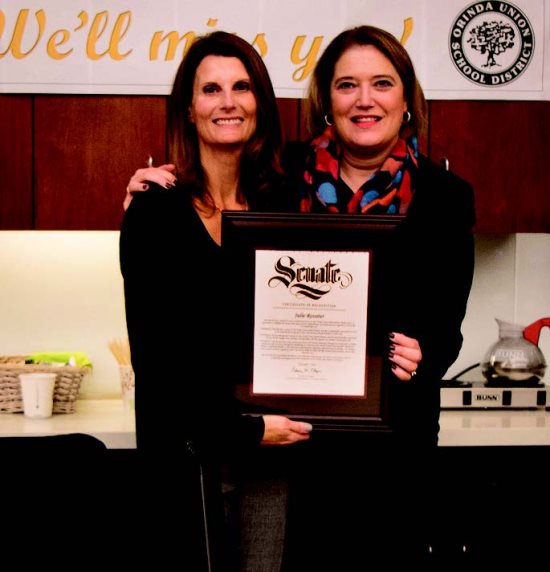 | | Published December 25, 2018 | OUSD honors Rossiter, welcomes Daoust, elects officers, and hears about fire danger | | | By Sora O'Doherty |  | | Outgoing Orinda Union School District board member Julie Rossieter was honored for her eight years service. Photo Sora O'Doherty | There was a large turnout on Dec. 10 to honor outgoing Orinda Union School District board member Julie Rossiter. Mayor Amy Worth came to celebrate her and to show her appreciation of her leadership. Representatives from the offices of Rep. Mark Desaulnier and state Sen. Steve Glazer also sung Rossiter's praises. First elected in 2010, Rossiter served eight years. Contra Costa County Supervisor Candace Andersen praised Rossiter's leadership on the school board, adding, "You gave up your life for eight years."