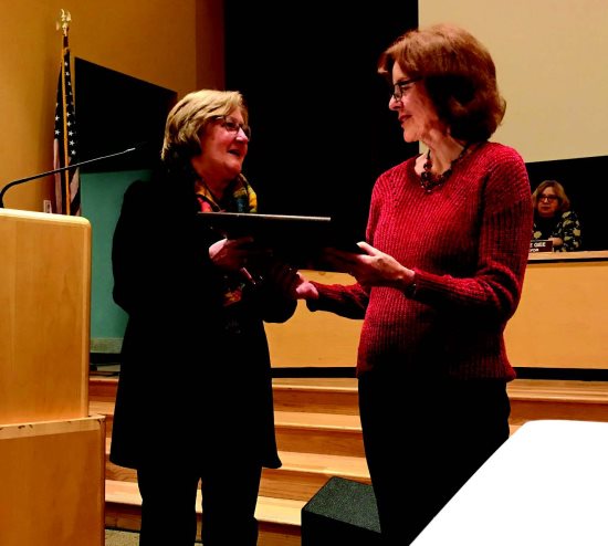 Outgoing Mayor Amy Worth presented her awards of excellence to Maggie Boscoe of the Lamorinda Arts Council, who has been the volunteer curator of the Orinda Library Gallery. Boscoe could not be present on Dec. 11, but did attend the Nov. 18 meeting to accept the award. She noted that in the 17 years she has been arranging monthly artwork displays, she calculates that she has presented 34,000 works of art to gallery visitors.
